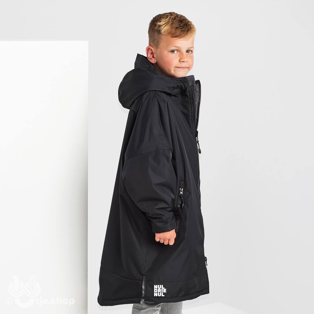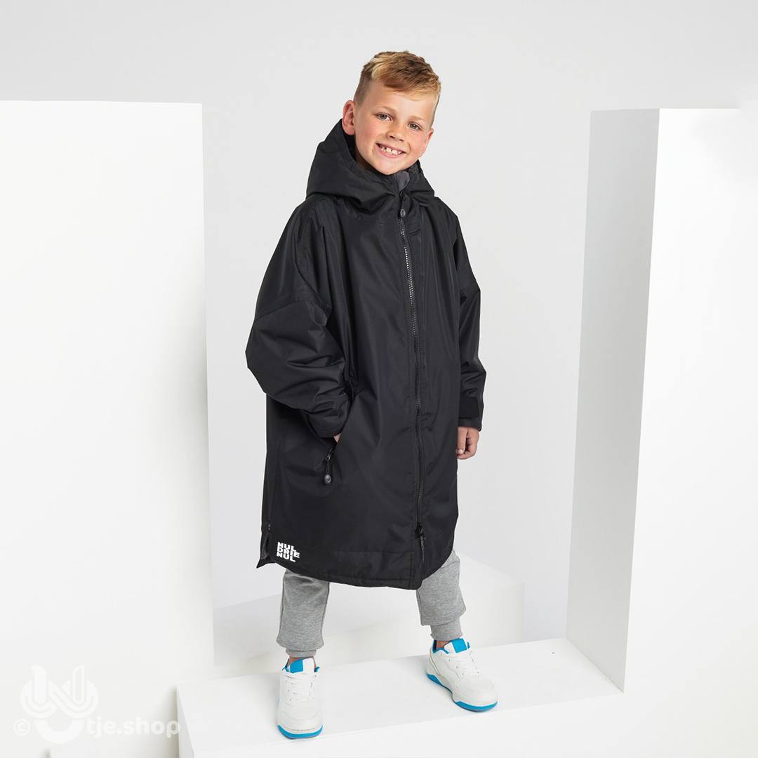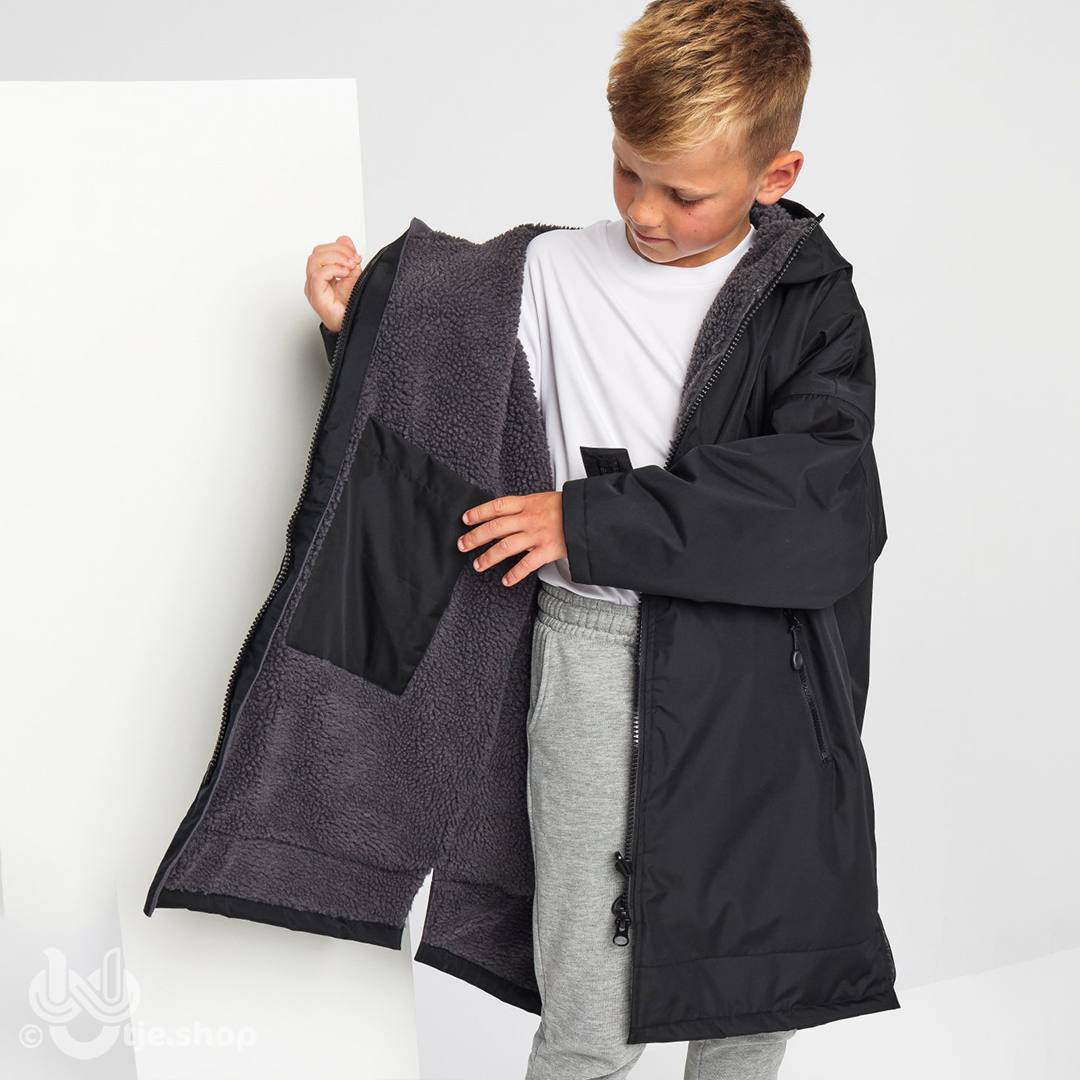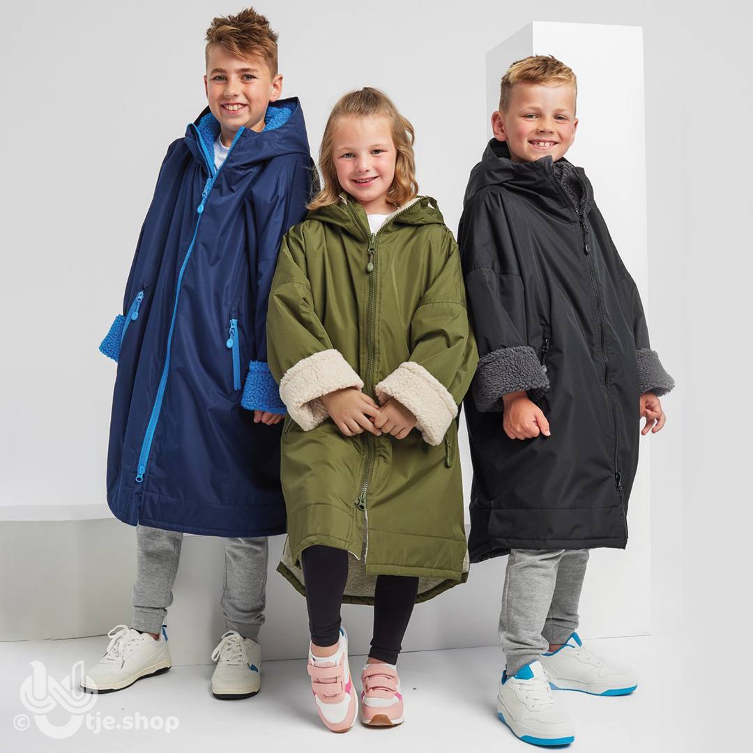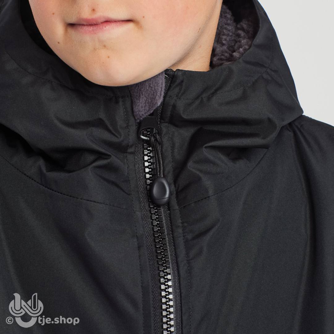 Een waterdichte jas met capuchon om je warm en droog te houden, met verstelbare bandjes aan de polsen en kin beschermer om de warmte vast te houden op winderige dagen. De behaaglijke sherpa-fleece binnen voering absorbeert vocht en houdt je warm, waardoor dit een geweldig kledingstuk is na wateractiviteiten of regenachtige dagen op het voetbalveld. Deze oversized jas is ideaal bij het aantrekken van warme, droge kleren en heeft een dubbele ritssluiting – dus meer bewegingsvrijheid! Met meerdere diepe zakken aan de binnen- en buitenkant is hij niet alleen perfect voor sporters, maar ook voor naar school en in de regen.